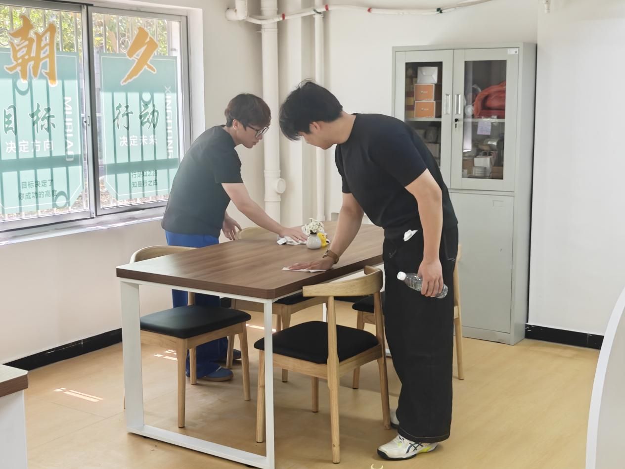 在打扫过程中,同学们不怕脏、不怕累,相互配合、默契协作。有的认真擦拭窗台、门框和桌面,去除灰尘污渍;有的仔细清扫地面、清理角落杂物;还有的主动整理物品、归置公共设施。面对卫生死角和不易清理的区域,大家耐心细致、反复擦拭,不放过任何一处细节。这些区域在同学们的共同努力下变得干净整洁、焕然一新。