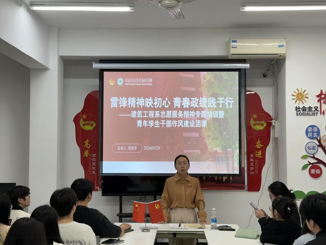 3月24日,建筑工程系开展“雷锋精神映初心 青春政绩践于行”志愿服务精神专题培训暨青年学生干部作风建设团课。培训内容围绕深入弘扬雷锋精神,强化青年学生干部宗旨意识与作风建设,引导学生骨干树立和践行正确政绩观。通过培训,明确全体学生干部,要从点滴做起、从实处发力,在平凡岗位上践行雷锋精神,在服务同学中彰显责任担当,努力成长为有理想、敢担当、能吃苦、肯奋斗的新时代建工青年骨干。