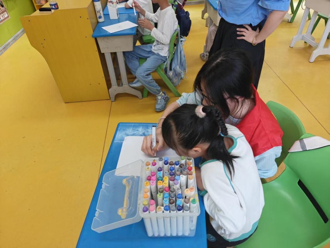 绘画环节中,志愿者们为孩子们准备了五彩的画笔和画纸,引导孩子们发挥想象,描绘心中的美好世界。有的孩子画出了五颜六色的花朵,有的孩子画出了温暖的太阳,还有的孩子牵着志愿者的手,一起勾勒出属于他们的“友谊画卷”。志愿者们一边陪伴孩子们创作,一边轻声和他们交流,倾听他们的想法,用陪伴温暖每一个稚嫩的心灵。