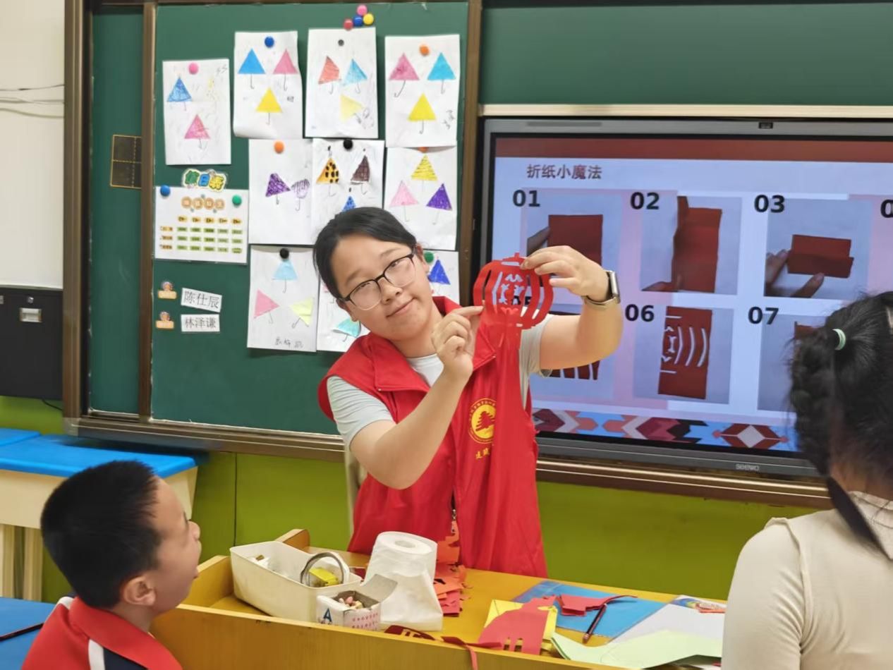 手工环节里,志愿者们手把手地教孩子们折纸、粘贴,耐心指导每一个动作,哪怕是简单的对折、粘贴,也会反复示范、悉心讲解,从不催促、从不急躁。有的孩子动作迟缓,志愿者便蹲下身,一点点辅助;有的孩子面露困惑,志愿者便用温柔的话语鼓励,给予他们满满的信心。看着孩子们手中渐渐成型的小作品,脸上露出纯真的笑容,志愿者们也满心欢喜。