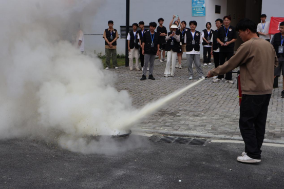 接下来由院安保处李靖瑜老师详细讲解了灭火器使用的注意要点,并对每一个环节的操作进行了说明,用“一提、二拔、三握、四压”的规范动作现场演示了干粉灭火器的正确使用方法。随后,随机挑选了几名同学轮流用干粉灭火器模拟现场灭火。在演练过程中,李靖瑜老师时刻关注学生的各项操作步骤,及时在现场给予指导和纠正。