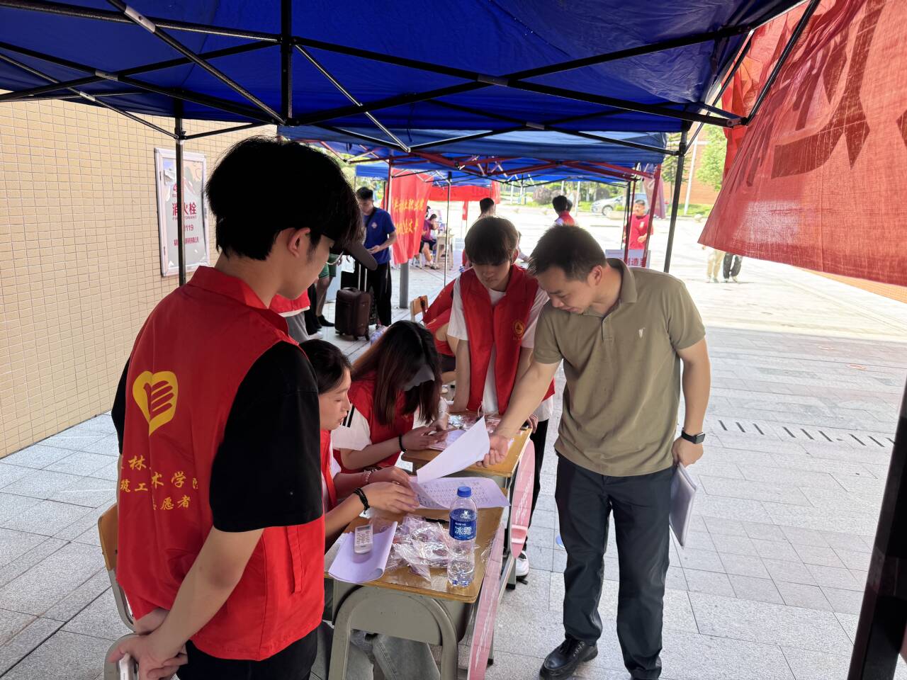 校园里,志愿者们早早地就忙碌起来。他们身着统一的服装,脸上洋溢着热情的笑容,在学校的各个角落迎接新同学的到来。从校门口到报到处,从宿舍区到教学楼,志愿者们的身影无处不在。他们主动上前帮忙提行李,耐心地解答新同学和家长们的各种问题,为初来乍到的新生们指引方向。