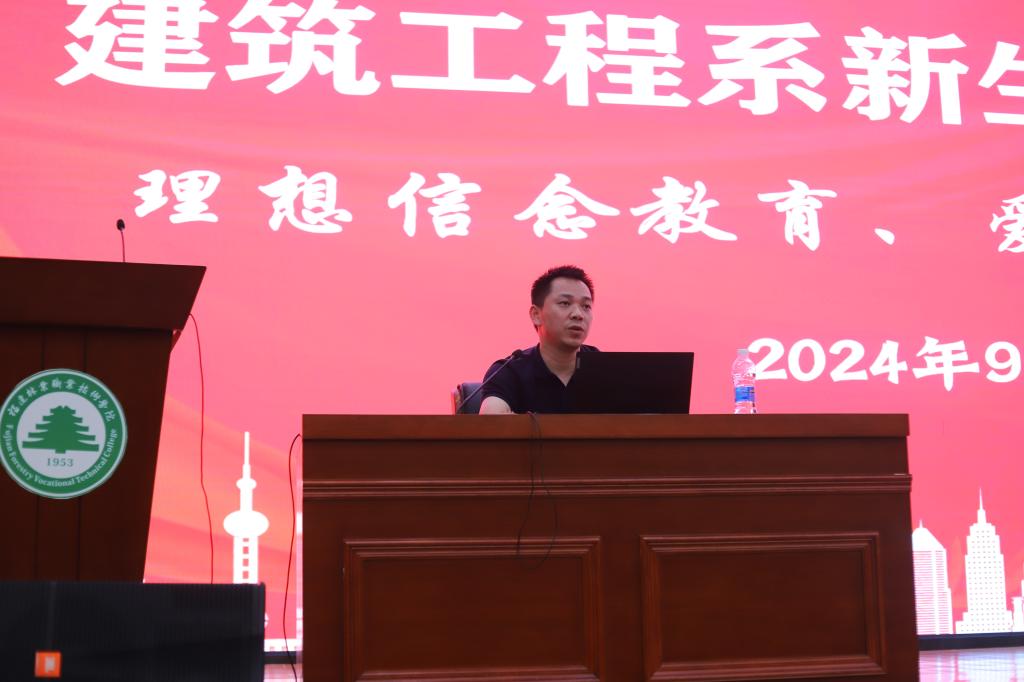 本网讯/为深入落实立德树人的根本任务,坚持为党育人、为国育才,激发学生的爱国热情,强化爱国主义与集体主义观念,增强学生的组织性和纪律性,培养新生团结拼搏的团队精神、良好的文明习惯与合作精神,9月7日,建筑工程系2024级新生入学教育系列讲座在学术报告厅举行。本次讲座由系党总支书记魏长专面向新生讲授,主题紧密围绕爱国主义教育展开,旨在激发新生的爱国情怀,提升他们的责任感与担当精神,助力青年一代为实现中华民族伟大复兴的中国梦而不懈奋斗,新生辅导员陈慧老师主持讲座。