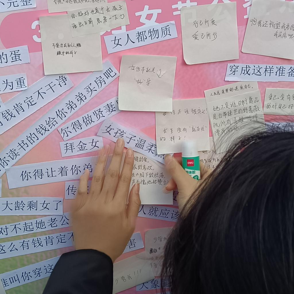 活动现场,一块特别的签名板吸引了众多同学的目光。五颜六色的手工扭花与承载着刻板印象的纸条相互映衬,同学们纷纷停下脚步,拿起笔,在签名板上郑重地写下自己的名字,随后伸手撕下那些束缚女性的刻板标签,宣告着对陈旧观念的挑战。撕掉标签后,大家写下对女性的美好祝福,如“人生最重要的是爱自己”、“祝你成为自己想要的模样”。
