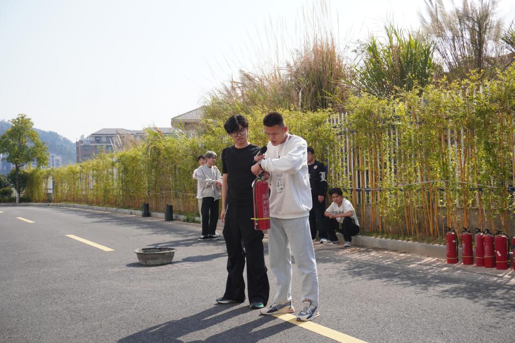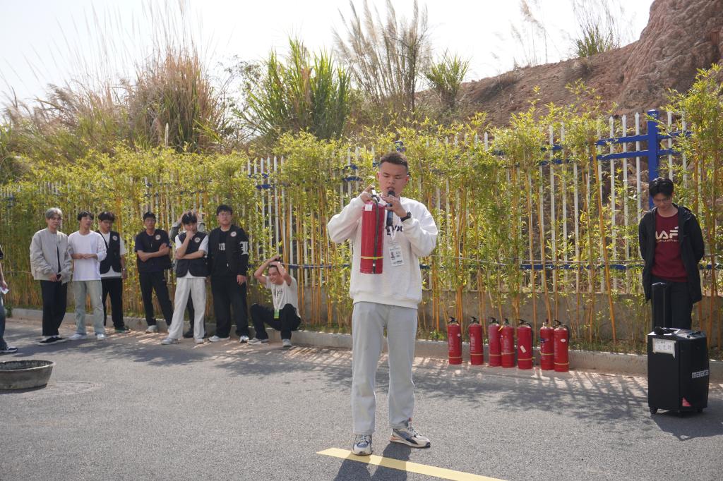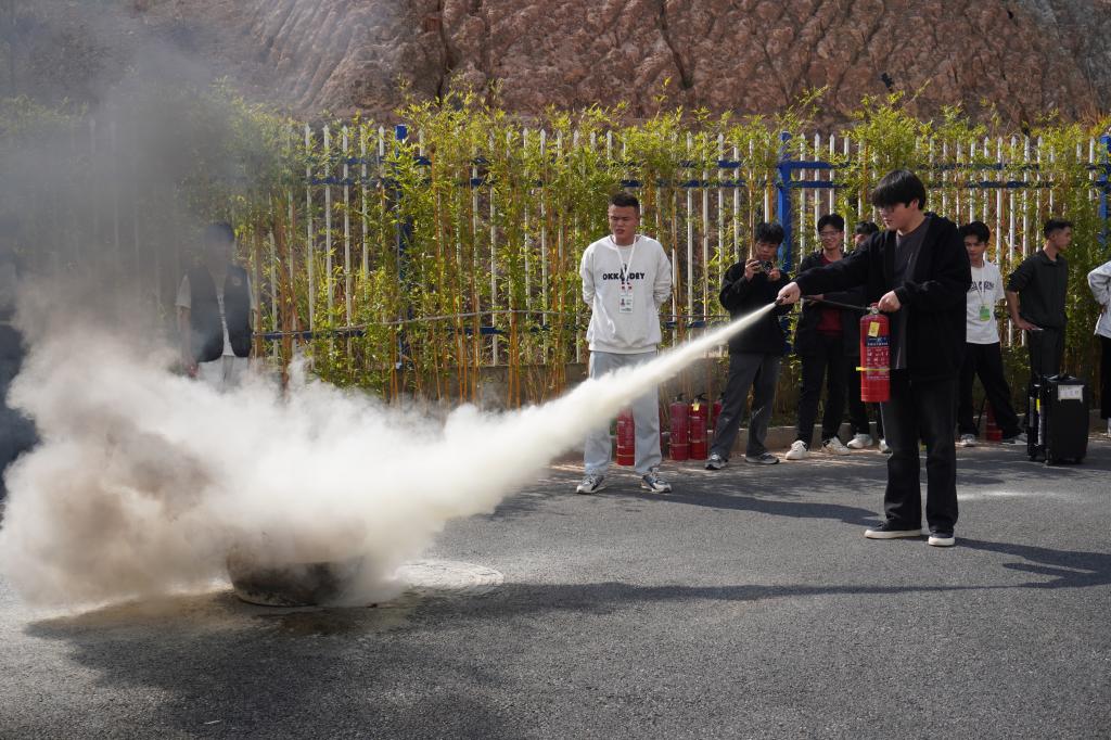演示完海姆立克急救法后,同学们转至外场,由院保卫部成员为同学们细致讲解灭火器使用时的关键注意事项,将每个操作环节逐一拆解说明。紧接着,老师通过“一提、二拔、三握、四压”的规范动作,现场演示干粉灭火器的正确使用方法,动作一气呵成,同学们一目了然。讲解和演示结束,老师随机挑选几名同学,让他们轮流上前,使用干粉灭火器模拟灭火场景。在演练过程中,老师始终观察着同学们的操作,帮助同学们切实掌握灭火器的正确使用方法 。
