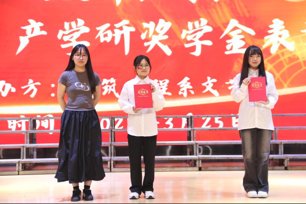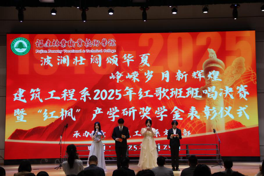 在红歌班班唱决赛热烈的氛围中,建筑工程系举行“红枫”产学研奖学金表彰仪式。“红枫”产学研奖学金由优秀校友林威向母校捐赠设立,旨在助力学子成长,推动学院产学研事业发展。