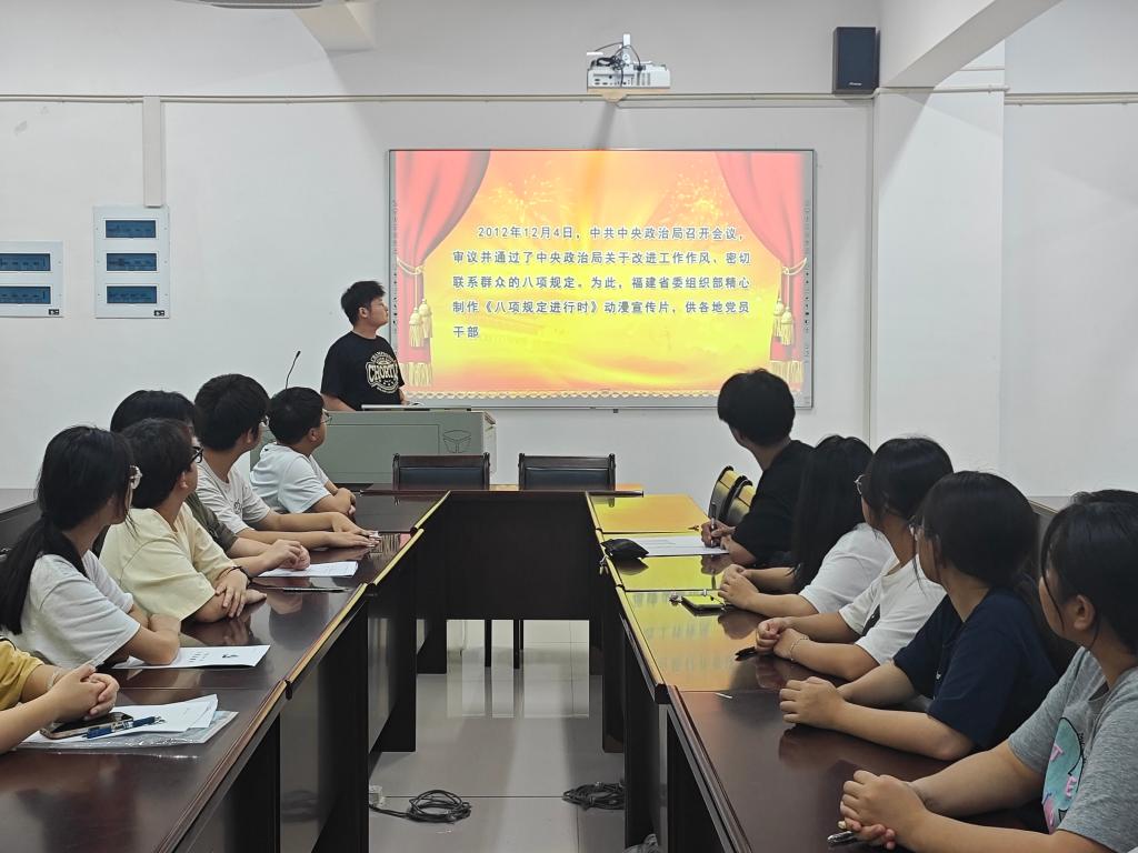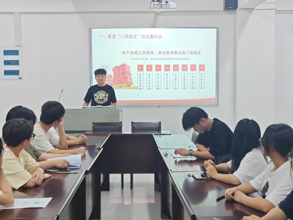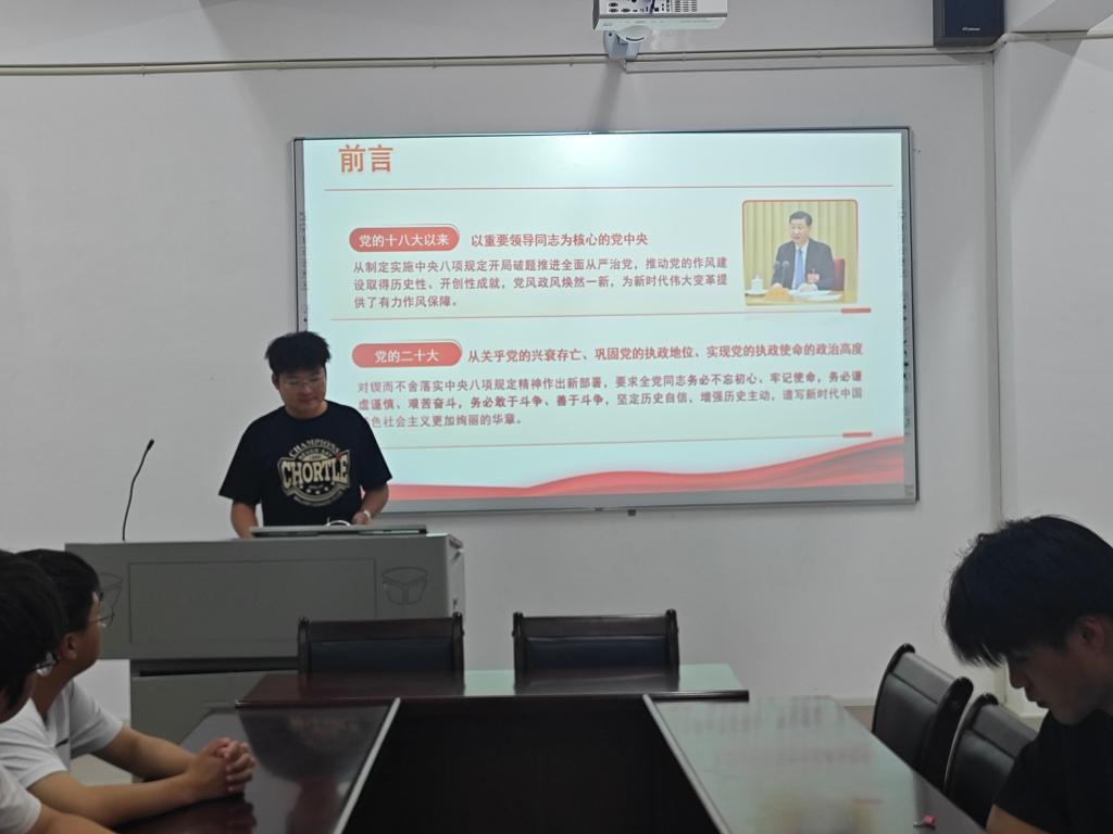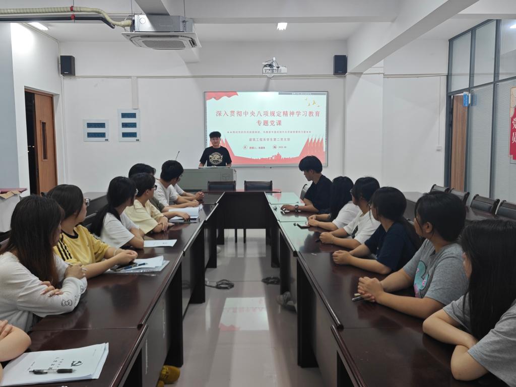 本网讯/为深入贯彻中央八项规定精神学习教育,进一步加强党员的思想与作风建设,切实提升师生党员纪律意识和服务意识。2025年6月25日,建筑工程系学生第二党支部书记张道良为支部全体师生党员讲授深入贯彻中央八项规定精神学习教育专题党课。