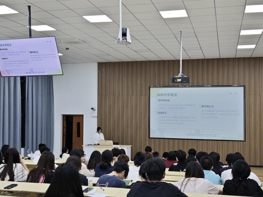 本网讯/为进一步提升学生干部日常管理效能,强化学生干部队伍建设,提升日常管理工作效能,保障加扣分制度规范、严谨执行,2025年6月5日,建筑工程系于阶梯教室二举办学生干部系列培训第六专题——"加扣分细则解读与加扣分单制作"专题培训。本次培训由系学生会秘书处主任刘艳、纪检部部长涂晋昌联合主讲,通过“理论+实操”双轨模式,系统讲解加扣分管理全流程要点。