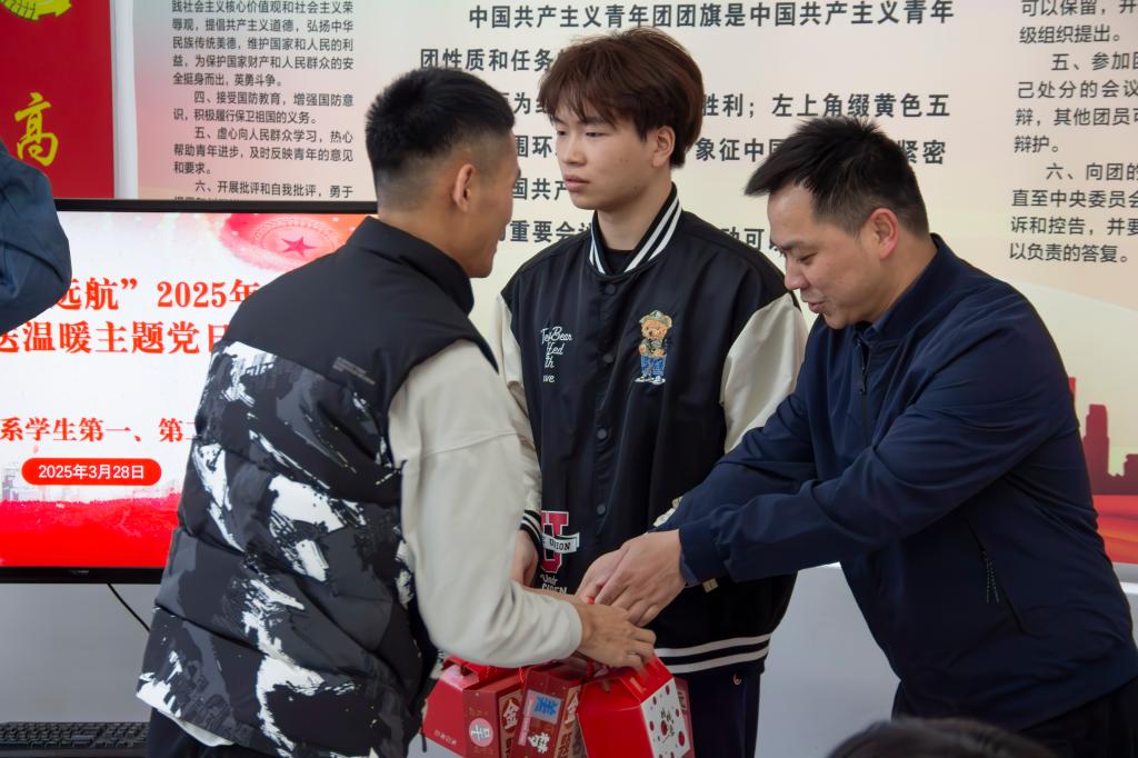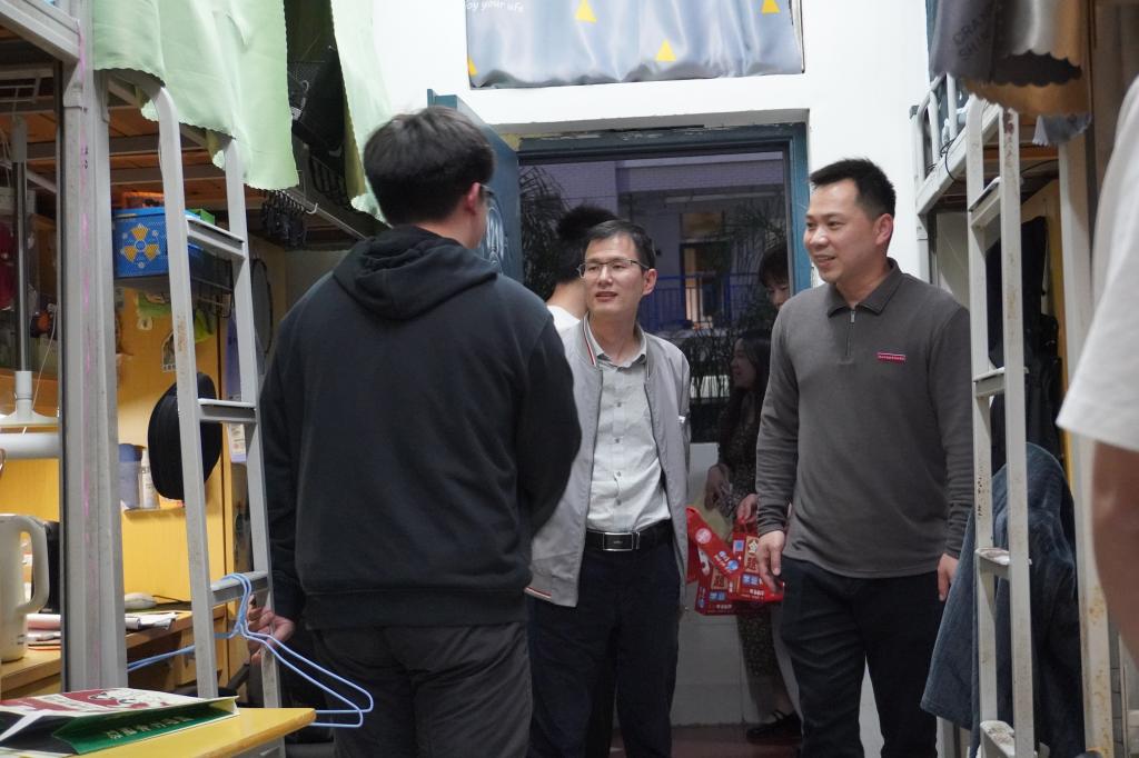 互赠寄语后,支部教师党员为考生党员发放“备考加油包”,内含金榜题名文具套装及柿柿如意陶瓷杯,承载着系部和组织满满的祝福和期望。同时为了打通组织关怀“最后一公里”,由学院党委副书记严绍裕、系党总支书记魏长专带队,支部教师党员深入学生宿舍“暖心送关怀”,除了送上“备考加油包”外,他们还和学生亲切交流,了解备考情况,给予备考建议,彰显党员的责任与担当。