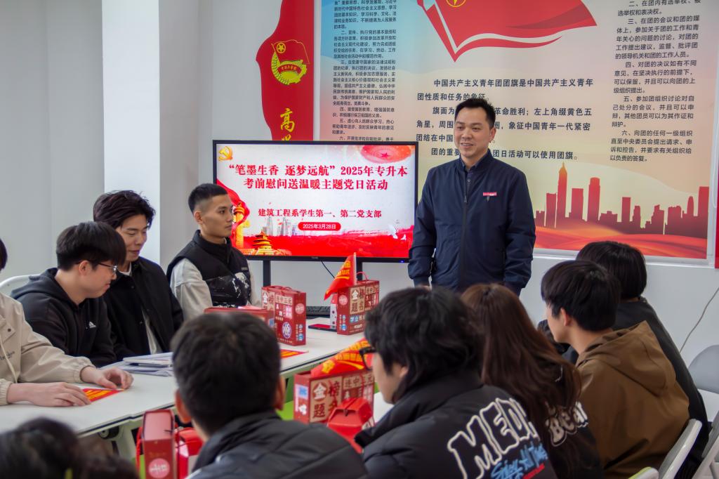 本网讯/为贯彻落实立德树人根本任务,坚持不懈用习近平新时代中国特色社会主义思想铸魂育人,积极探索党建引领“一站式”学生社区育人工作新模式,2025年3月28日,建筑工程系学生第一、第二党支部在“一站式”学生社区开展“笔墨生香 逐梦远航”2025年专升本考前慰问送温暖主题党日活动。学院党委副书记严绍裕,学生工作部部长陈友益,系党总支书记魏长专,专职组织员叶新颖,学生科科长兼团总支书记刘克芹,学生党支部书记陈慧婷、张道良,副书记林燕琼和支部全体教师党员及考生党员代表参加活动。