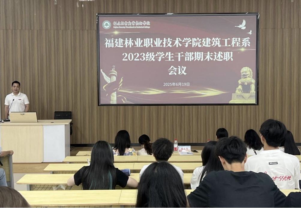 本网讯/为全面总结学生干部在本学年中的工作表现,深入总结工作经验,查找存在问题,明确改进方向,进一步提升学生干部的综合素质和履职能力,增强学生组织的凝聚力和执行力,为今后的学生工作夯实基础。建筑工程系于2025年6月19日在阶梯教室二成功开展了2023级两委会学生干部期末述职评议活动。本次述职评议由建筑工程系2023级两委会各部门学生干部进行现场述职,系党总支书记魏长专老师、系学生科科长兼团总支书记刘克芹老师及各部门分管老师共同评议,2024级储备干部及干事到现场观摩学习。
