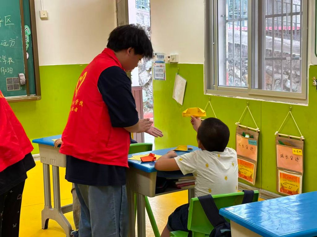 在手工课上,支教志愿者们首先向孩子们展示了用彩纸折叠出的栩栩如生的小青蛙,轻轻一按,青蛙还能“跳”起来,立刻引起了孩子们的阵阵惊呼和浓厚兴趣。随后孩子们在志愿者的帮助下都成功折出了“会跳的青蛙”。这节手工课不仅锻炼了孩子们手眼协调能力,更让他们在折叠中感受到创造的乐趣与成就感。