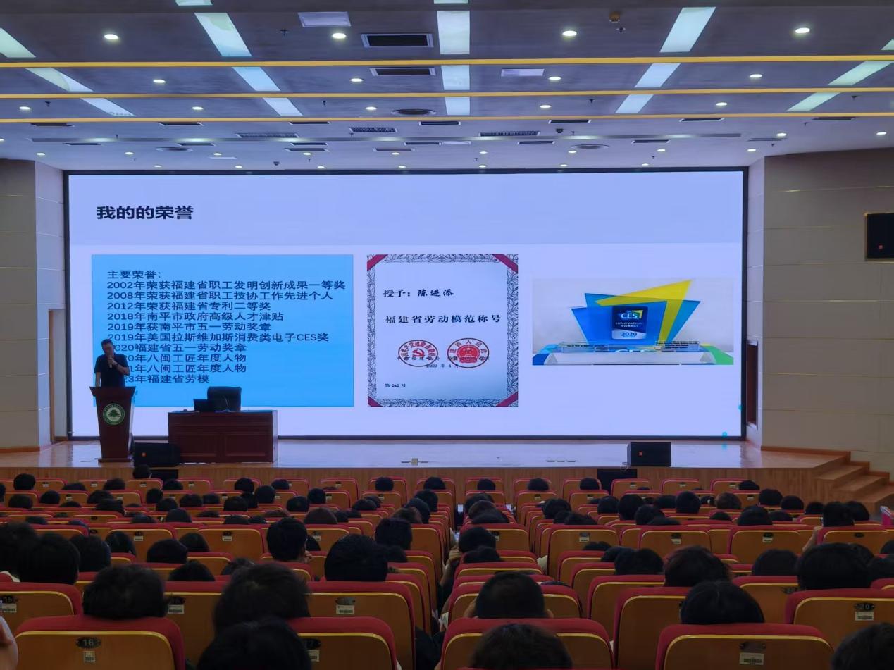 本网讯/为深化2025级新生对智能建筑行业的认知,破解专业学习迷茫,厚植创新与劳动精神,9月27日,建筑工程系特邀请福建省劳动模范、八闽工匠,福建南平南孚电池有限公司研发经理陈进添,为建筑工程技术、建筑智能化工程技术、智能建造技术专业新生开展劳动教育专题讲座暨职业生涯规划指导课。本次活动由建筑工程系副主任张李平老师主持。