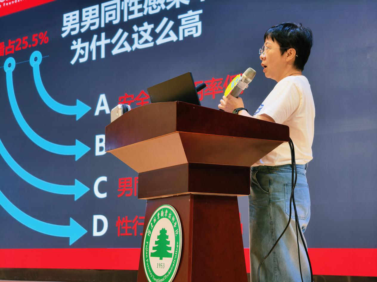 讲座伊始,李丹老师率先开展分享,围绕青年性健康教育与性伤害识别预防两大核心主题展开讲解。为打破大家对性话题的羞涩与隔阂,她创新采用生动形象的情景模拟方式,将抽象的“性”概念转化为具体可感的场景,引导同学们科学建立对“性”的初步认知。同时,她结合性传播的生理机制与现实案例,清晰阐释了性健康与艾滋病预防的关联,让大家在理解生命知识的基础上,进一步深化了对艾滋病危害与防范逻辑的认识。