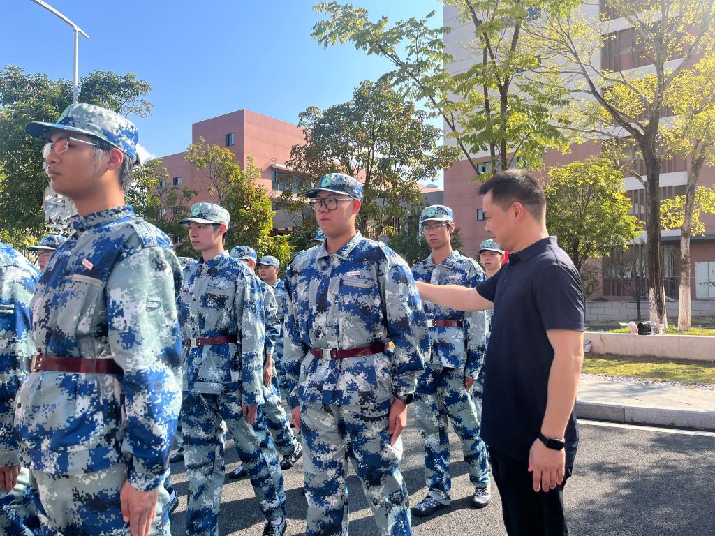 本网讯/2025年10月16日,建筑工程系党总支书记魏长专、系副主任张李平、系专职组织员叶新颖、系教务科科长廖坤阳、学生科科长兼团总支书记刘克芹及新生辅导员一行深入军训场地,亲切看望正在参加军训的2025级新生及教官,为烈日下坚持训练的学生送去关怀与鼓励。