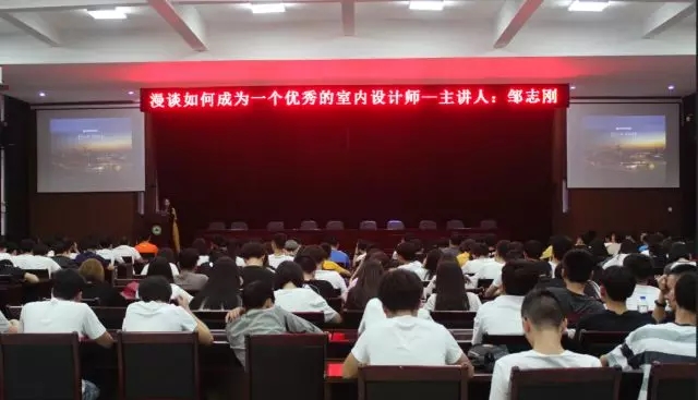 面对16、17级建筑室内设计专业与建筑装饰专业的200多名学生,邹志刚总监侃侃而谈,就“如何成为一名优秀的室内设计师”提出了他的思考与见解。讲座伊始,邹总监便抛出“设计细节”这一问题,指出室内设计与现实生活息息相关,设计即创意,需要不断地琢磨学习。接着,邹志刚先生结合自身的设计理念与工作经验,以设计效果图为基础为同学们系统地讲述了室内设计相关前沿理论,设计风格发源、发展等相关专业知识。