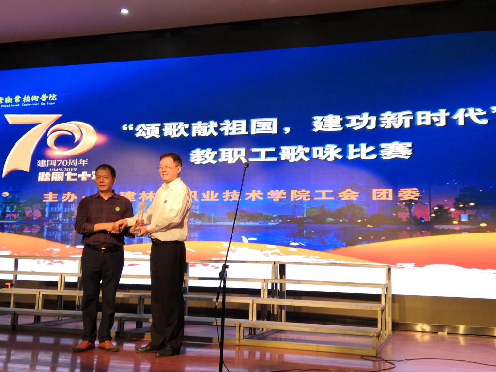 本网讯10月22日晚,建筑工程系教职工代表队参加学院工会、团委组织的欢庆新中国成立七十周年系列活动之“颂歌献祖国,建功新时代”教职工歌咏比赛。比赛过程中,我系教职工团结一心,以热情、饱满、昂扬、自豪的状态全情投入演唱之中,将一曲拳拳爱国的“我的中国心”激情澎湃地精彩传唱,强烈引起现场观众的爱国共鸣,掌声、欢呼声此起彼伏,最终凭借87.143分的好成绩一举夺得本次比赛的桂冠。