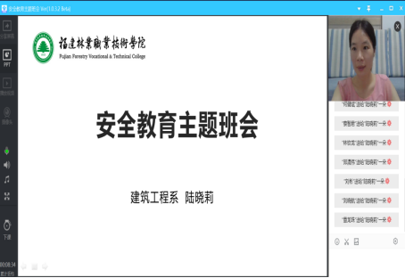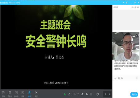 本网讯 为加强我系学生安全教育,全面普及校园安全常识,增强学生安全防范意识,提高学生安全防范能力,8月5号晚7点30分,我系各班级通过腾讯课堂组织开展了2019级学生“暑期安全教育”主题班会,系学生科科长陆晓莉、辅导员吴文杰及全体2019级学生参加了此次班会。