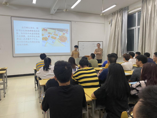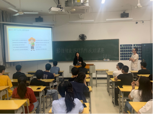 班会上,各班班长和团支书先带领大家观看公益短视频,让同学们从直观上认识到粮食浪费不只是资源上的浪费,还会对环境造成恶劣的影响,加强同学们对浪费粮食危害的认识,引起同学们珍惜粮食反思。其次,结合PPT内容,向同学们介绍当前我国粮食浪费情况、珍惜粮食重要性等,并向同学们提出节约粮食八点倡议。最后,各班级辅导员教育同学们要继承和发扬中华民族勤俭节约传统美德,带动身边的人,一起参与到珍惜粮食的行动中。