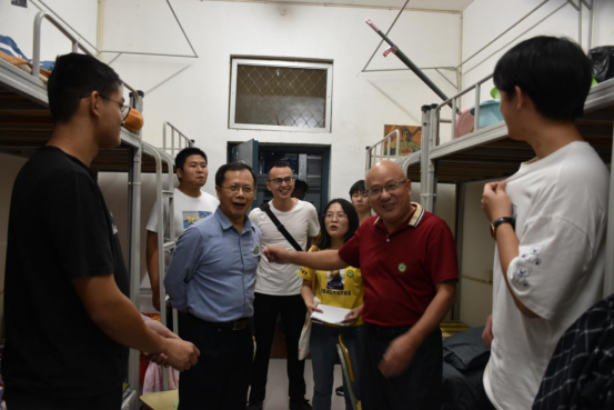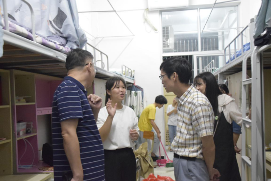 迎新结束当晚19:30,院纪委书记林建斌、副院长谢金生、系党总支书记王云彪、系主任彭忠伟等一行人走访全部新生宿舍,并与新生亲切交谈,询问学生对校园环境、食堂饭菜、住宿条件等满意情况。院系领导们嘱咐室友间要团结友爱,注意自身安全及财务安全,并勉励新生安心学习,珍惜大学生活,做好人生规划,努力成长成才。