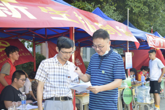 林建斌书记、谢金生副院长看到系部师生井然有序的工作及充满热情服务,对此表示肯定,鼓励他们继续保持现有的干劲和热情态度,为家长、新生提供细致周到的服务,确保每位新生安全、有序入学。接着,林书记、谢副院长分别询问了新生及家长引导、报到流程、住宿安排等情况,系党总支书记王云彪、系主任彭忠伟分别就这些问题一一解答。最后,林书记、谢副院长就迎新工作提出几点建议,并强调要进一步把迎新工作做细做实,及时为家长、新生排疑解难,确保迎新工作圆满完成。