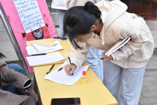活动现场,工作人员准备了精美的信纸、信封,供参与活动的同学使用。对前来咨询的同学,工作人员都耐心讲解活动具体形式和注意事项,并细心指导写信的同学登记信息。在这短短的三天里,虽寒风凌冽,但同学们参与活动热情和工作人员服务热情丝毫不减,参与活动的同学们用文字抒写心中事,表达心中情,工作人员用他们的行动为同学们的大学生活中送去温暖,缓解同学们的心灵压力,传递着每一份情愫与希冀。