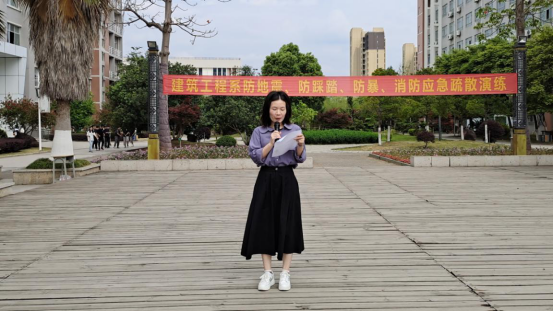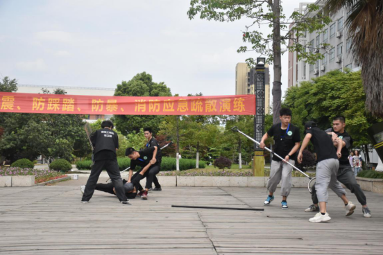 接着哨声再次响起,全体学生按照教室逃生路线,迅速从教室撤离至人工湖。王云彪书记、陆晓莉老师为本次演练做总结发言,向同学们强调消防安全的重要性,要求同学们切实提高自身安全意识及应对紧急突发事件能力。随后,全体同学观看由建筑工程系保卫部同学组织的防恐防暴安全演练。