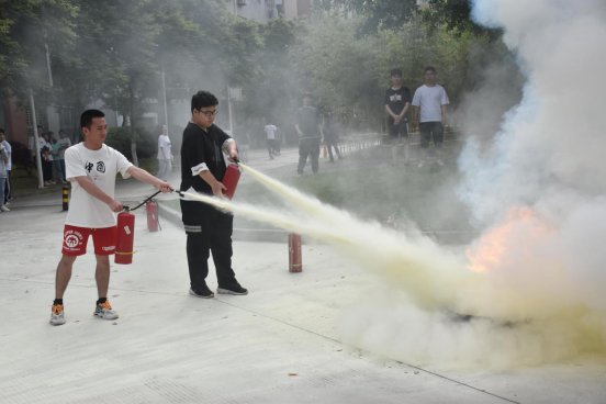 最后,由安保处处长胡宗焕老师讲解灭火器的使用方法、注意事项,并进行灭火器实操演练。在认真听讲及观摩后,老师和学生们亲自体验了现场灭火的过程,胡宗焕老师在现场对大家使用灭火器的动作进行规范指导。