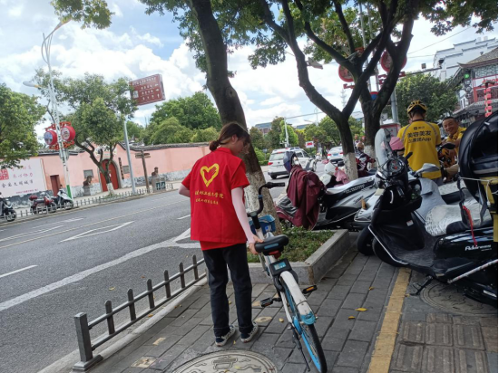 摆放一次共享单车。队员们将乱停放的共享单车摆放到指定区域,为美化城市的市容市貌贡献自己的一份力量。