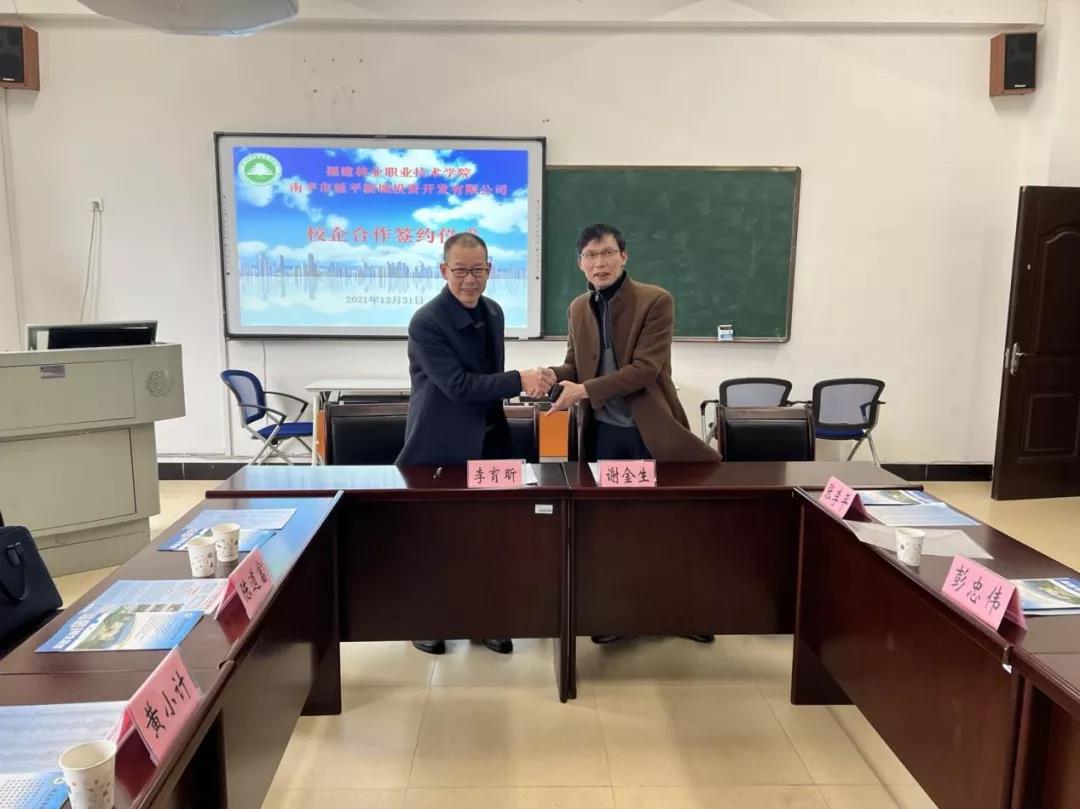 2021年12月31日,南平市延平新城投资开发有限公司与福建林业职业技术学院校企合作签约仪式在学院办公楼五楼会议室顺利举行,福建林职院副院长谢金生,建筑工程系主任彭忠伟、书记王云彪以及院系老师张李平、陆晓莉、廖坤阳、吴超兴等;土发集团总工程师兼新城公司董事长李育昕,新城公司总经理陈道富、副总经理黄小计、经营部经理杨玉琴等有关人员出席了本次签约仪式。
