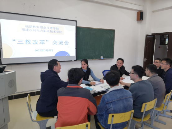 本网讯 2022年3月8日,福建水利电力职业技术学院电力工程学院朱文强院长、建筑工程学院名师工作室林梅芬老师来我系就“三教改革”问题进行调研。建筑工程系主任彭忠伟、信息工程系主任华建祥、建筑系教学科长张李平、专职组织员叶新颖等一众老师参与了此次会议。