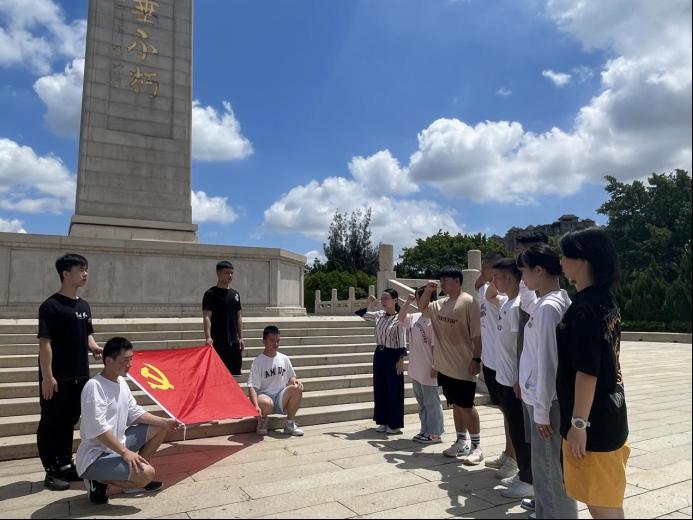 实践团中,7名学生党员为退役军人,为纪念这个特殊的日子,他们身着迷彩、步履坚定。在庄重肃穆的革命烈士纪念碑前,师生党员深情鞠躬并重温入党誓词,表达了对革命先烈们深切的缅怀和无比的敬仰。