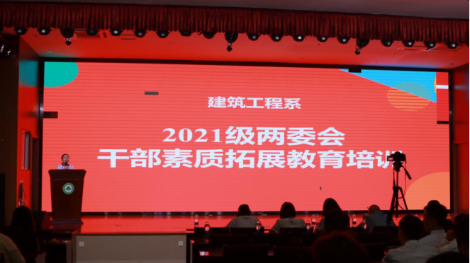 本网讯/为进一步提高学生干部素质,加强学生干部队伍建设,在学生组织中营造良好氛围,培养学生干部积极向上、团结一致的精神风貌和良好的道德情操,6月27日晚,建筑工程系2021级两委会干部素质拓展教育培训在江南礼堂举行。本次培训会由建筑工程系学生科科长兼团总支书记刘克芹老师主讲,建筑工程系党总支书记王云彪、各班辅导员和2021级两委会学生干部出席本次活动。
