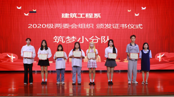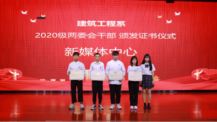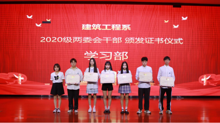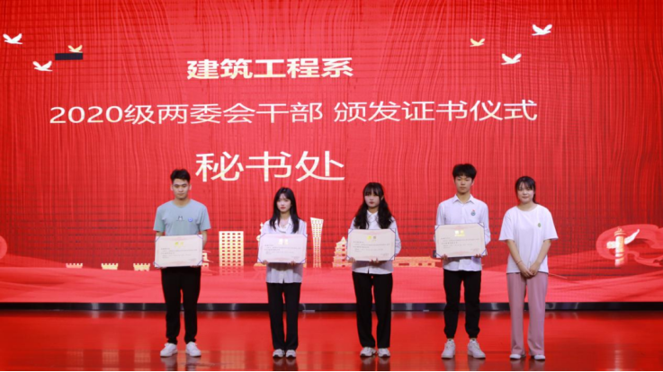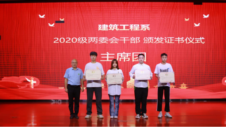 本网讯/建筑工程系高度重视学生干部队伍建设工作,为激励我系学生干部队伍不忘初心、牢记使命、继续奋进,6月27日晚,建筑工程系2020级两委会干部颁发证书仪式在江南礼堂举行。建筑工程系党总支书记王云彪老师、马克思主义学院副院长陆晓莉老师、建筑工程系专职组织员叶新颖老师、信息工程系学生科科长兼团总支书记吴文杰老师、建筑工程系学生科科长兼团总支书记刘克芹老师以及系辅导员林燕琼老师、陈晴老师、陈慧婷老师、葛璇老师、丁雨涵老师和2020、2021级两委会学生干部出席本次活动。