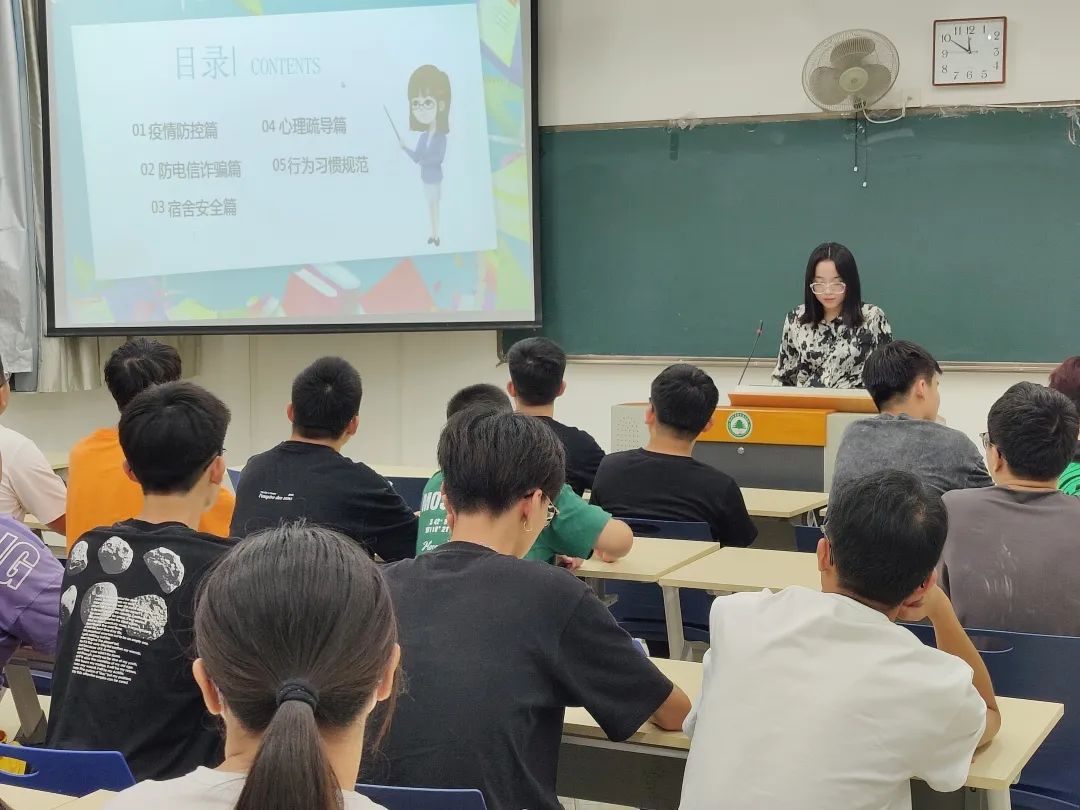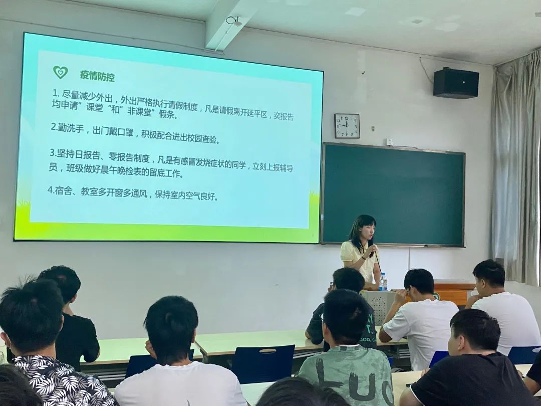 本次主题班会围绕疫情防控教育、心理健康教育、安全教育等方面展开。各班辅导员强调要重视疫情防控,严格遵守学校疫情防控管理规定,出门做好防护措施,佩戴好口罩;会上还提出,要同学们提高安全意识,严禁使用高功率电器,严禁私自下河游泳,谨防电信诈骗;并根据各班情况,结合宿舍安全、卫生等方面,要求同学们尽快调整状态,明确目标,制定学习计划,以饱满的热情投入新学期的学习中。