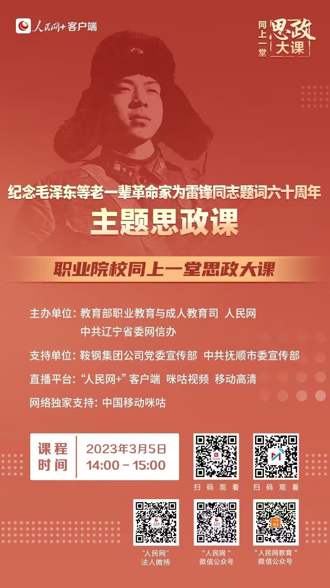 本网讯/为学习贯彻习近平总书记对深入开展学雷锋活动的重要指示精神,纪念毛泽东等老一辈革命家为雷锋同志题词六十周年,教育部职成司会同人民网策划制作了主题思政课。3月5日下午,我系组织各班学生共同学习观看“纪念毛泽东等老一辈革命家为雷锋同志题词六十周年”主题思政课——职业院校同上一堂思政大课,深入学习雷锋精神,深刻领会雷锋同志的“钉子精神”和全心全意为人民服务的奉献精神。