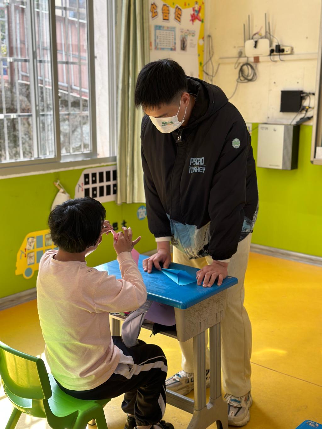 手工课上,志愿者们为小朋友进行折纸步骤的讲解,在遇到不理解的步骤时,志愿者们以浅显易懂的讲解和操作反复地示范,教孩子们用彩纸折出各种形状的物品,如飞机、船、花等。孩子们在折纸过程中不仅锻炼了自己的动手能力和创造力,还增进了与志愿者们的亲密感。