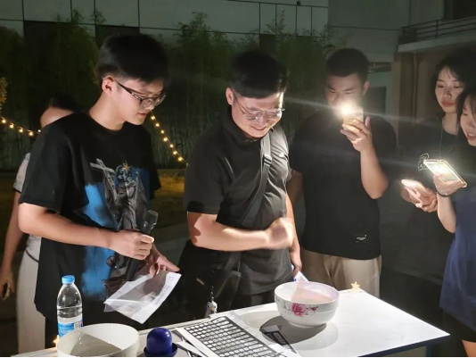 节目表演告一段落,有趣的博饼环节登场。主持人向大家讲解了博饼规则,现场师生共同参与博饼互动,随着第一位“状元”的诞生,将活动气氛推向了高潮。在场全体师生一起在花坛周围赏月、吃月饼,共同体验着“海上生明月,天涯共此时”的中秋情怀。