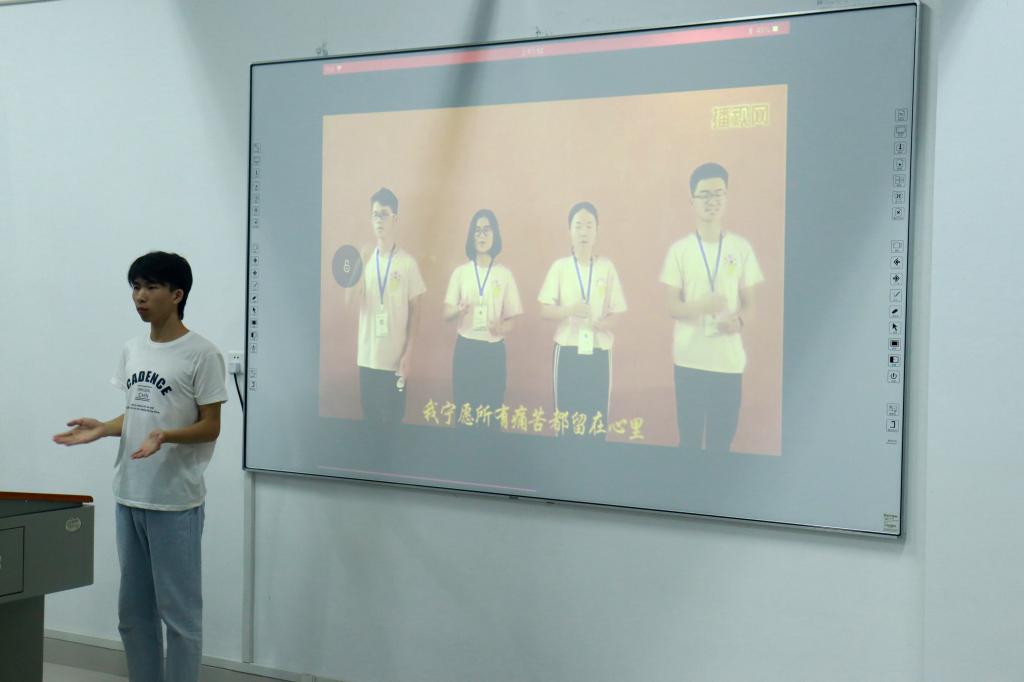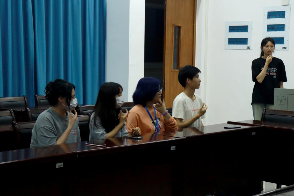 “你好”这个词语用手语要怎么表示呢?在手语里表达“你好”分为两部分:首先紧握拳头,伸出食指,向着对方,接着…”手语培训会上,筑梦小分队手语队的队员们全神贯注地学习手语知识。