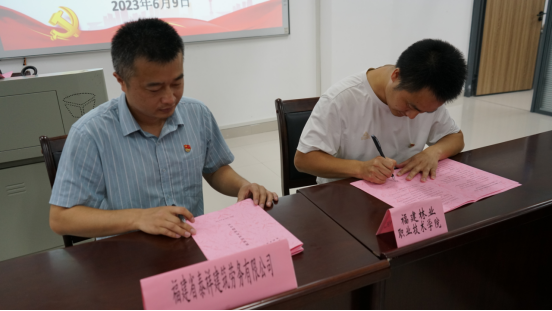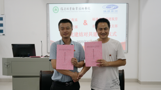 随后,建筑工程系教工党支部书记廖坤阳与福建省泰祥建筑劳务有限公司党支部书记吴喜达共同签署党建结对共建协议。