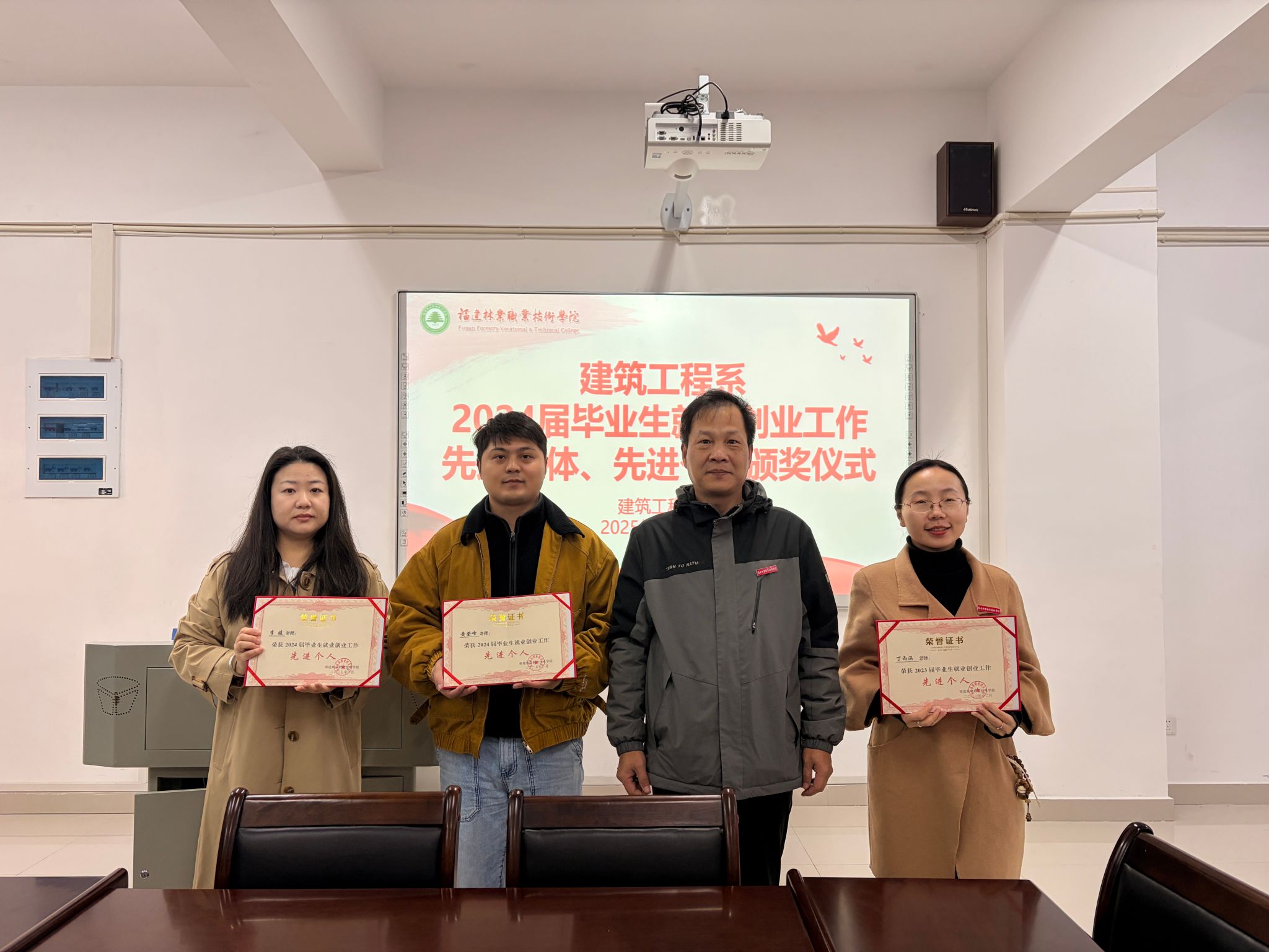 本网讯/为总结就业创业工作成效,表彰先进典型,凝聚工作合力,2025年12月9日,建筑工程系2024届毕业生就业创业工作先进集体、先进个人颁奖仪式在建工楼502举行。学院副院长黄晖,招生就业处处长陈莉、副处长黄庆斌,建筑工程系党总支书记魏长专、主任彭忠伟出席仪式,系部相关负责人、辅导员参加活动。