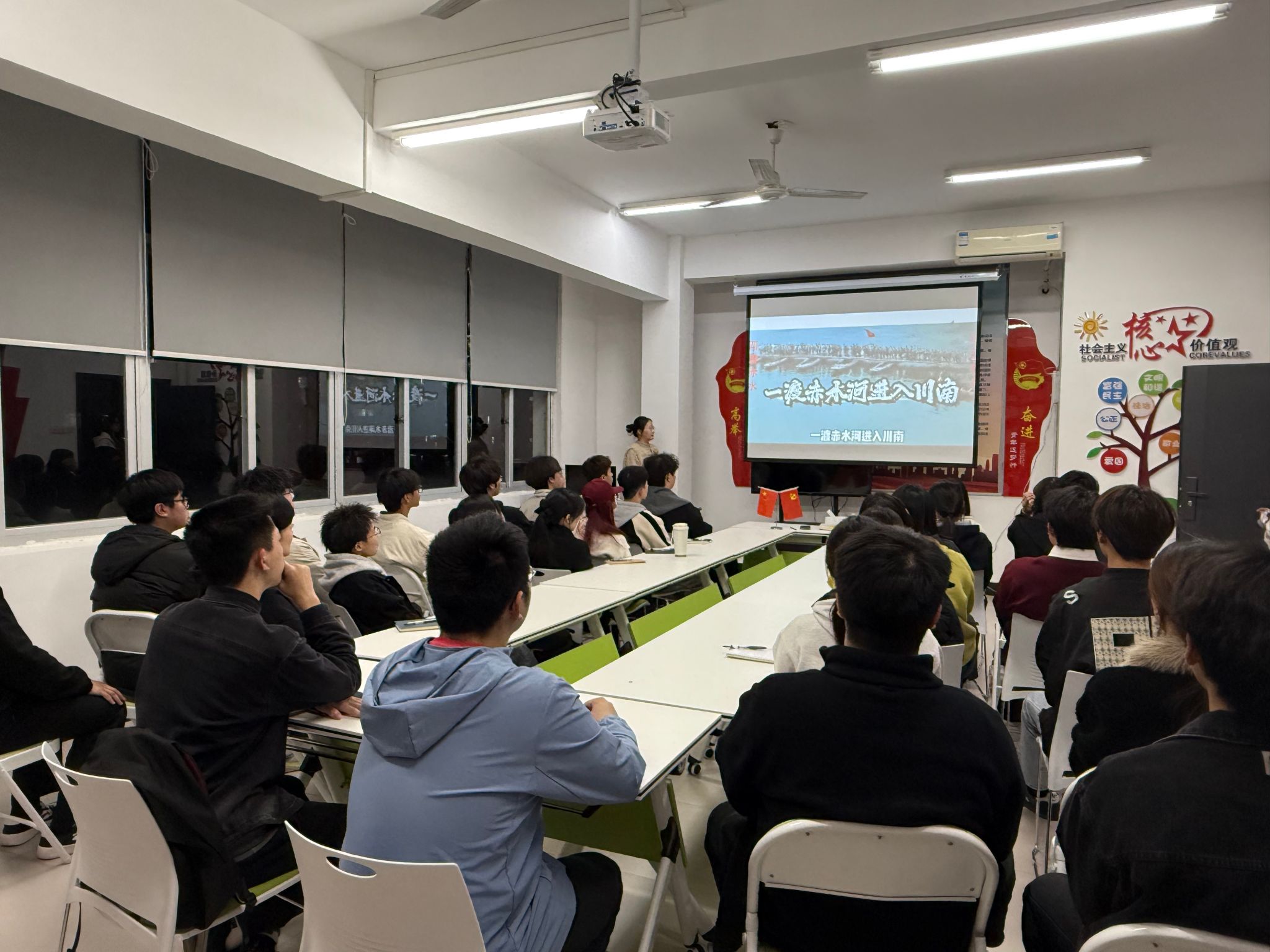 为让大家更直观地感受长征的艰难与智慧,党支部书记胡静老师以毛泽东同志的诗篇引入,带领大家回顾了“四渡赤水”的历史背景与战略意义。随后,全体成员共同观看了《四渡赤水》的精彩片段。
