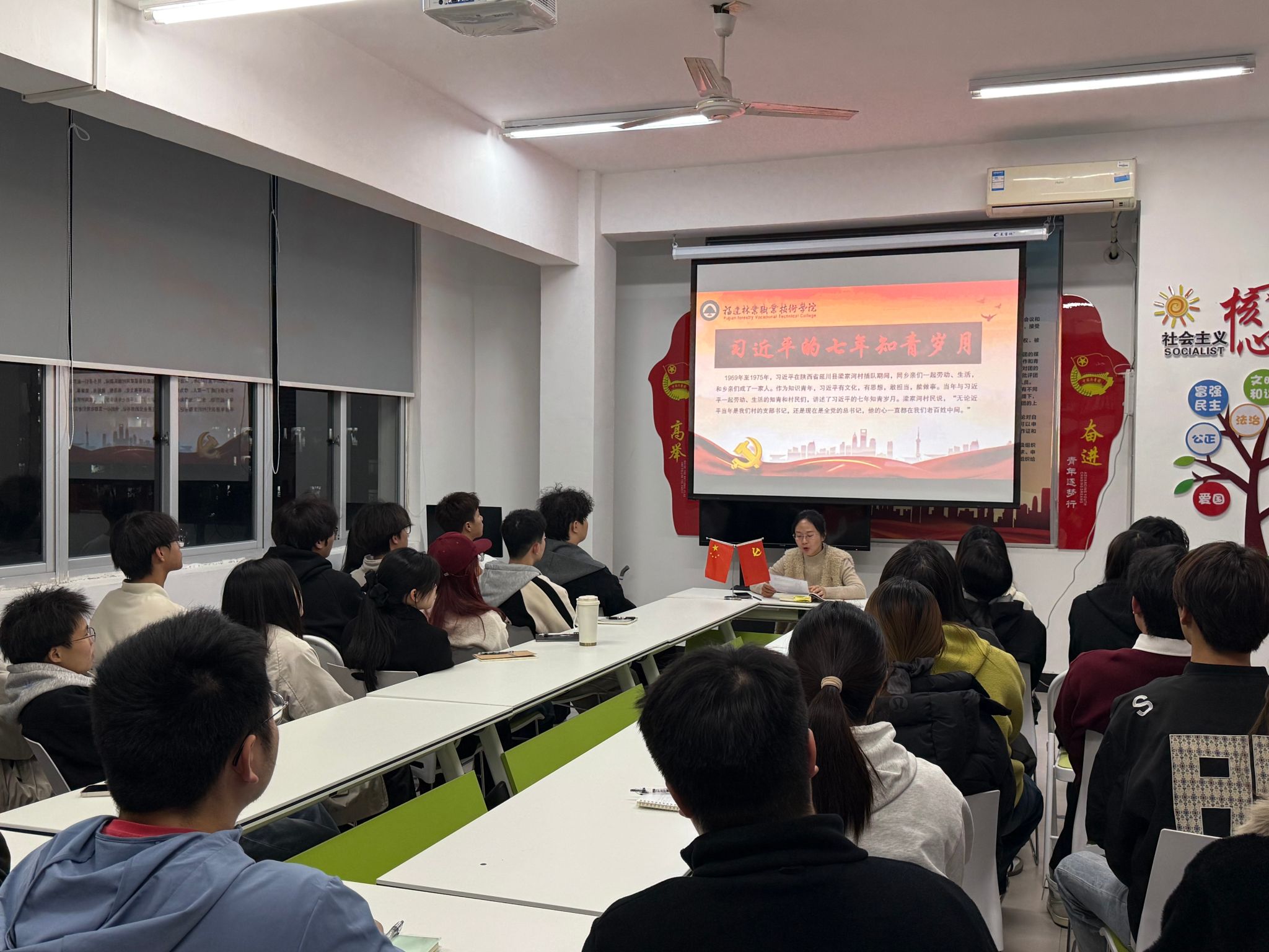 在领学《习近平的七年知青岁月》“习近平把自己看做黄土地的一部分”章节时,胡静老师讲述了青年习近平扎根基层、与群众同甘共苦的故事,引导学生感悟为民情怀。