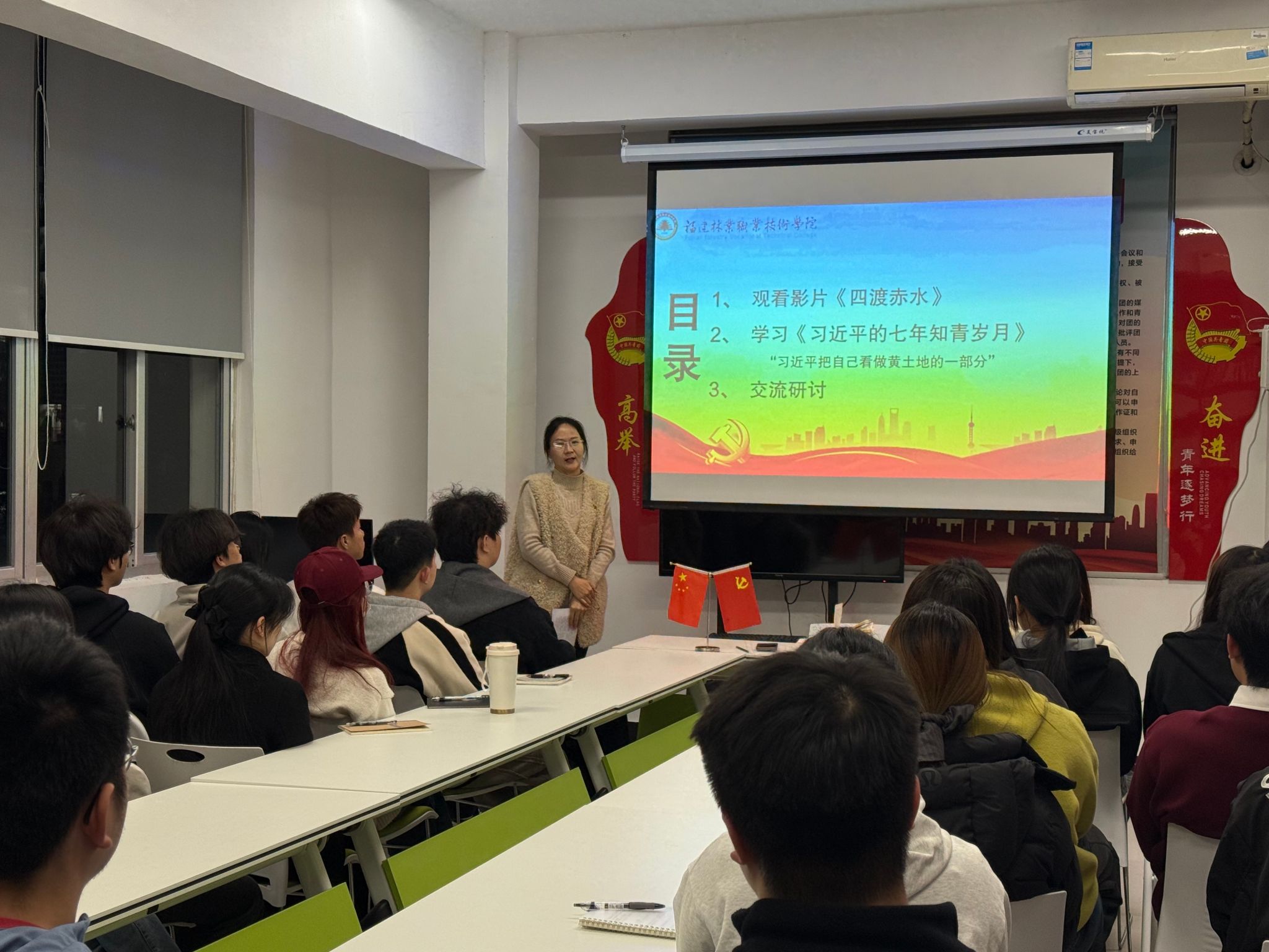 活动中,大家观看了《四渡赤水》片段,学习《习近平的七年知青岁月》选段,并开展交流研讨。