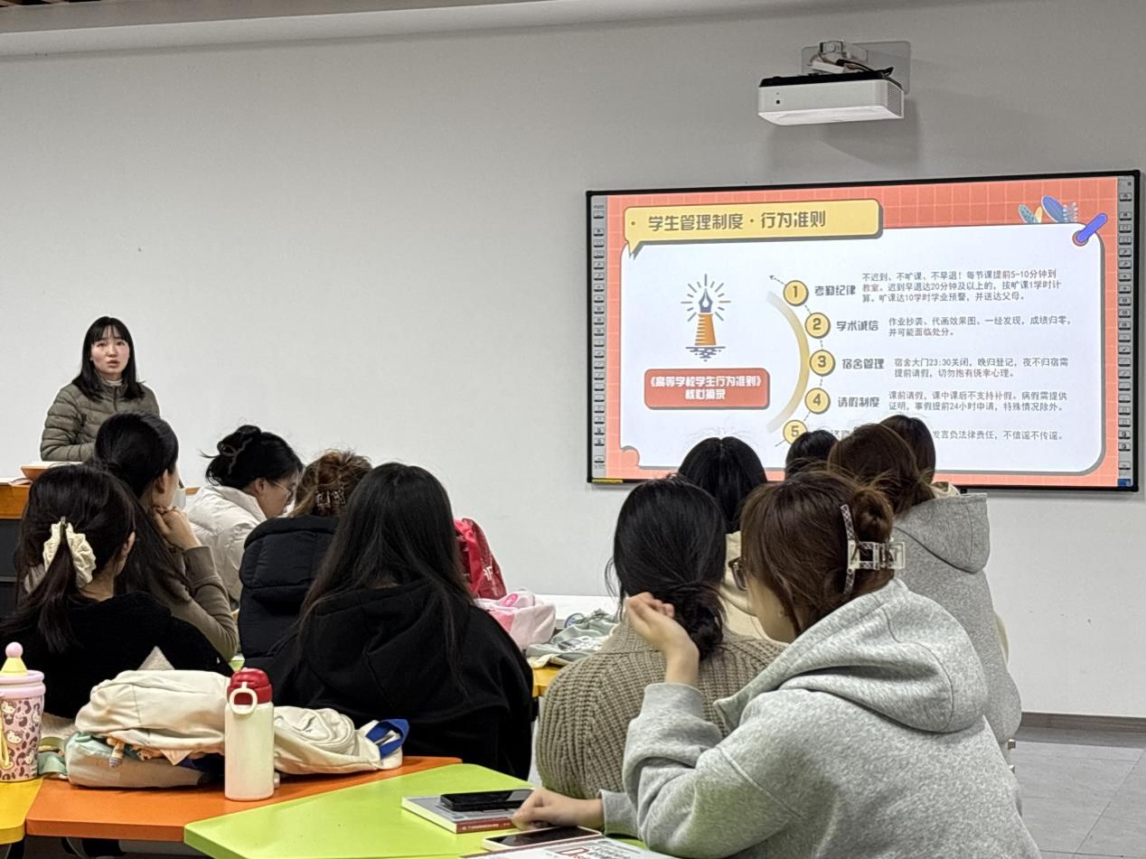 在实践教育层面,班会聚焦学生成长发展的关键需求,系统开展多维度教育引导。围绕安全教育,辅导员结合网络安全、防诈骗、交通安全等典型案例进行深入剖析,切实提升学生的风险防范意识与自我保护能力;针对学生管理制度,详细解读高等学校学生行为准则及系部相关管理规定,帮助学生明确行为规范,强化规则意识;在心理健康与法治教育方面,关注学生心理状态,普及心理健康知识,同时开展法治宣传教育,引导学生尊法学法守法用法;在行为养成教育中,倡导良好的学习生活习惯,培育优良班风学风,助力学生全面成长成才。