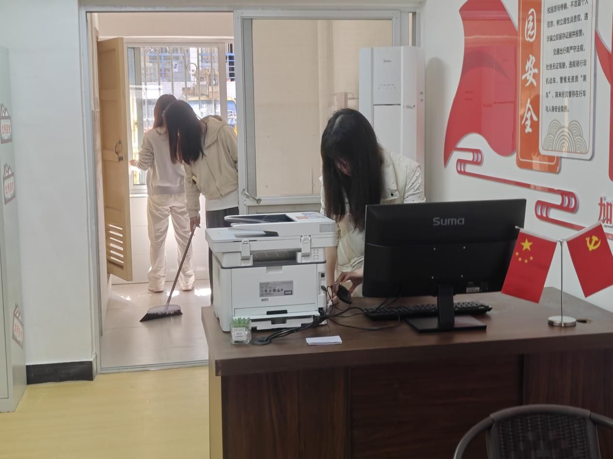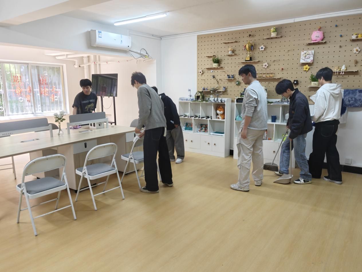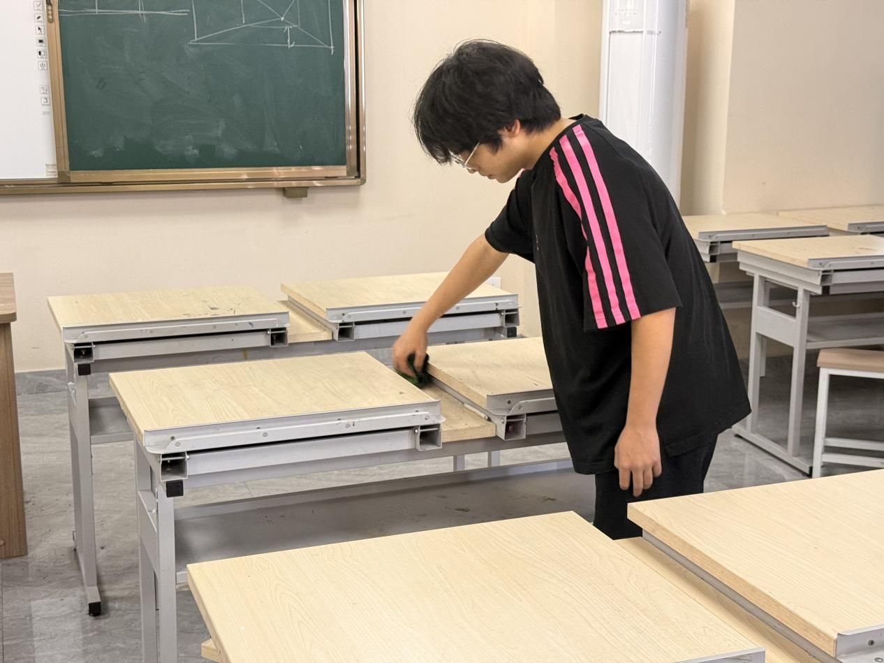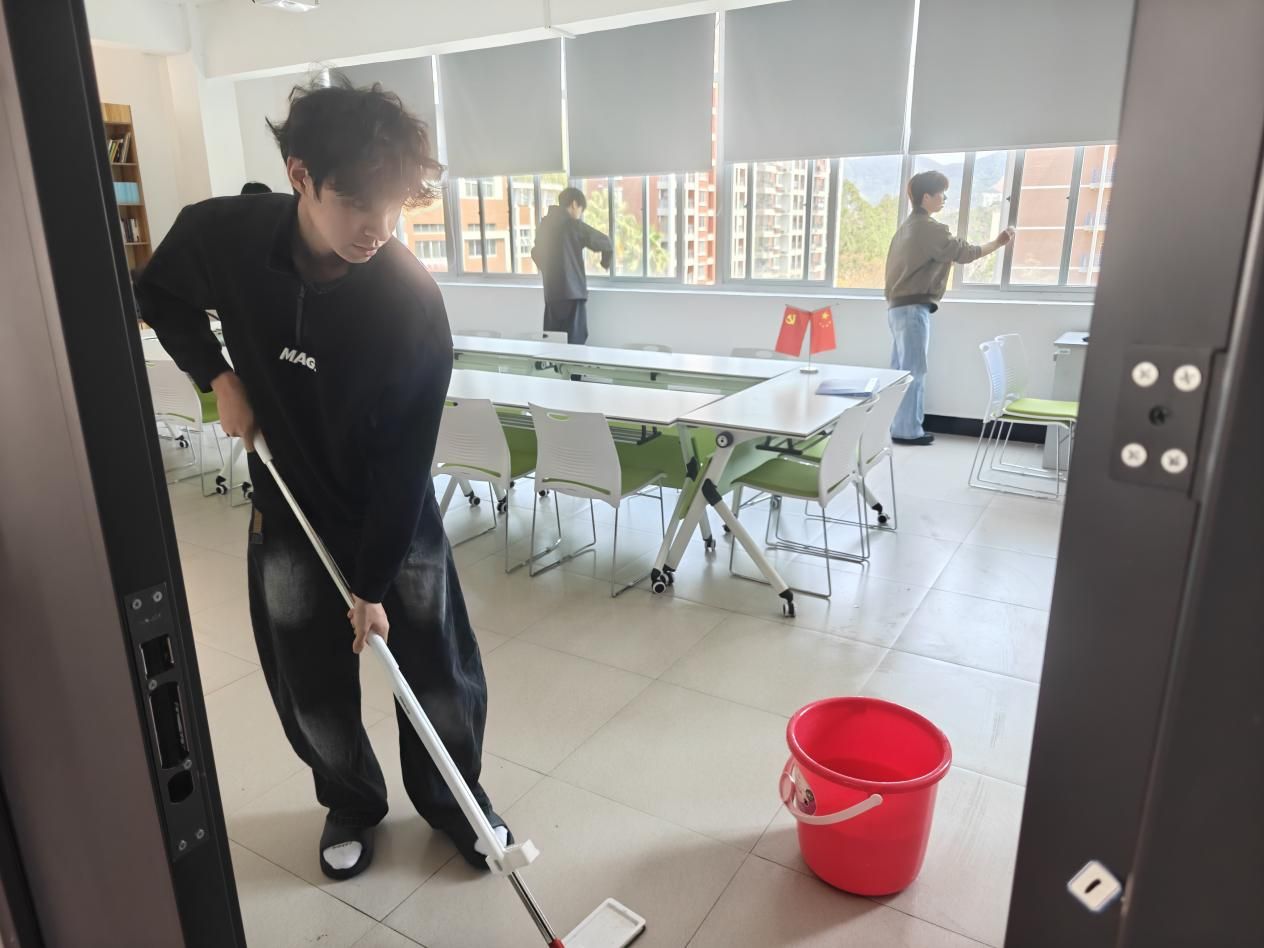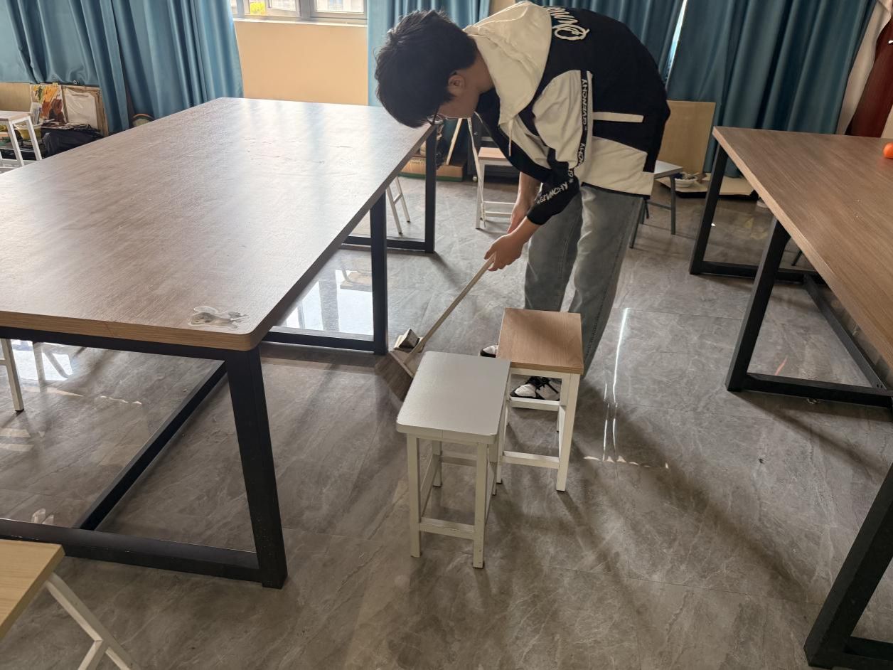 在打扫过程中,同学们不怕脏、不怕累,相互配合、默契协作。有的认真擦拭窗台、门框和桌面,去除灰尘污渍;有的仔细清扫地面、清理角落杂物;还有的主动整理物品、归置公共设施。面对卫生死角和不易清理的区域,大家耐心细致、反复擦拭,不放过任何一处细节。这些区域在同学们的共同努力下变得干净整洁、焕然一新。