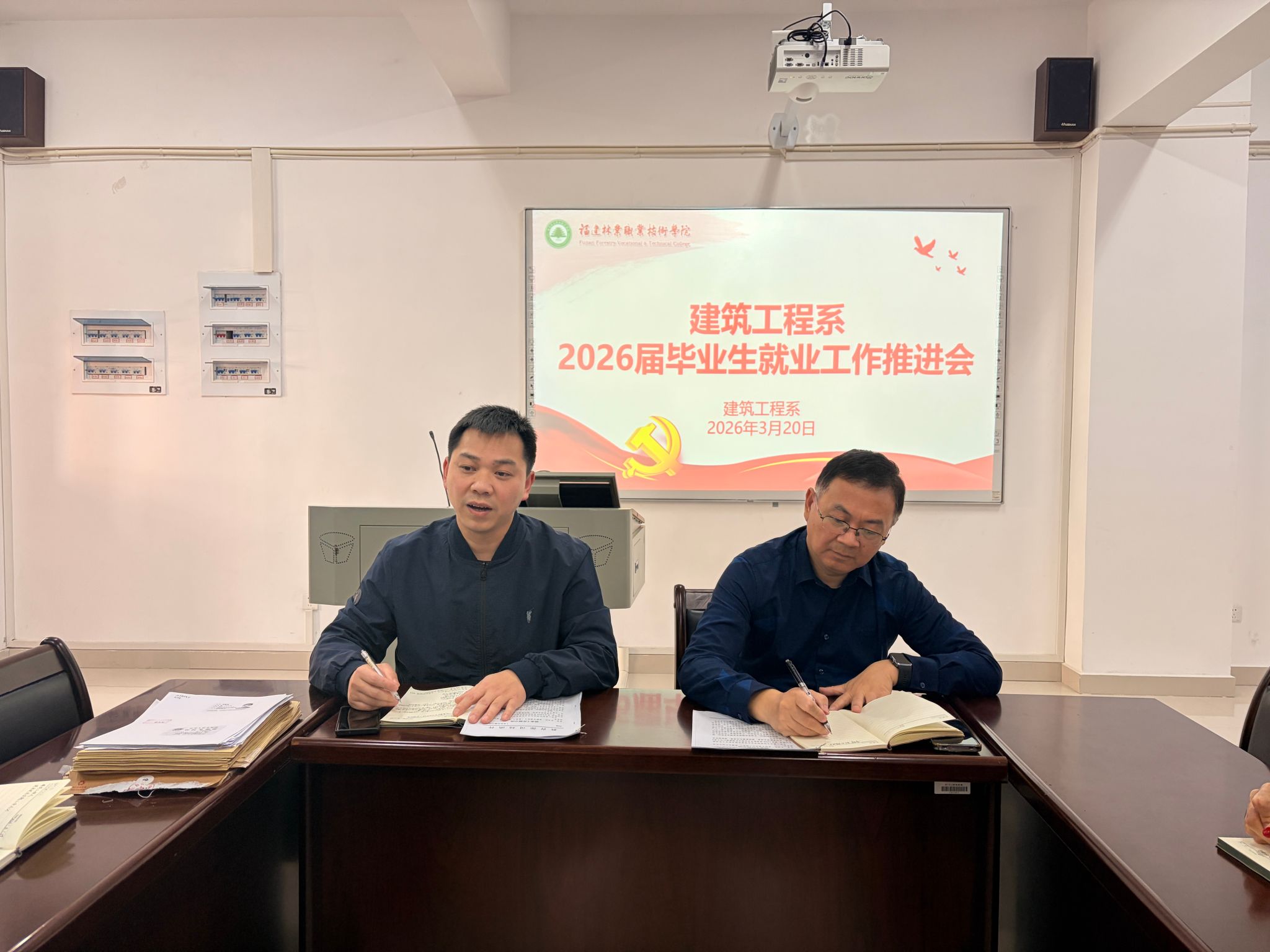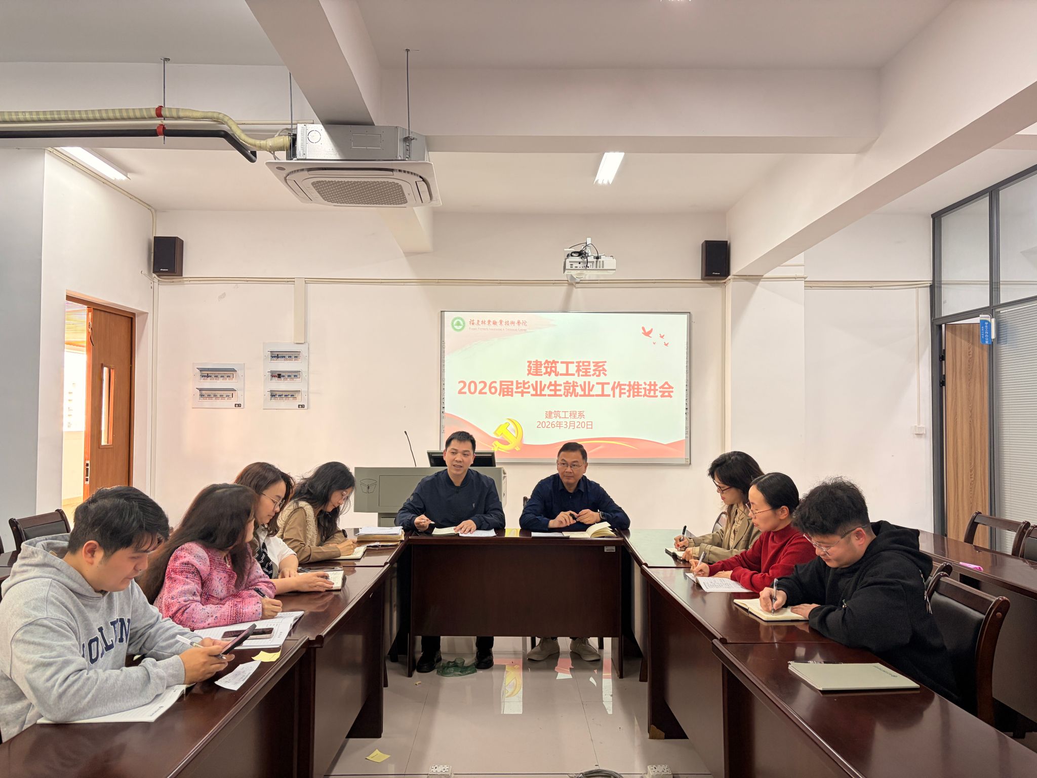 本网讯/2026年3月20日,建筑工程系召开2026届毕业生就业工作推进会,系党总支书记魏长专、系主任彭忠伟、党总支副书记陈蕾羽及学工组全体成员参会,共同研判就业形势,部署下一阶段重点工作,全力护航毕业生高质量就业。