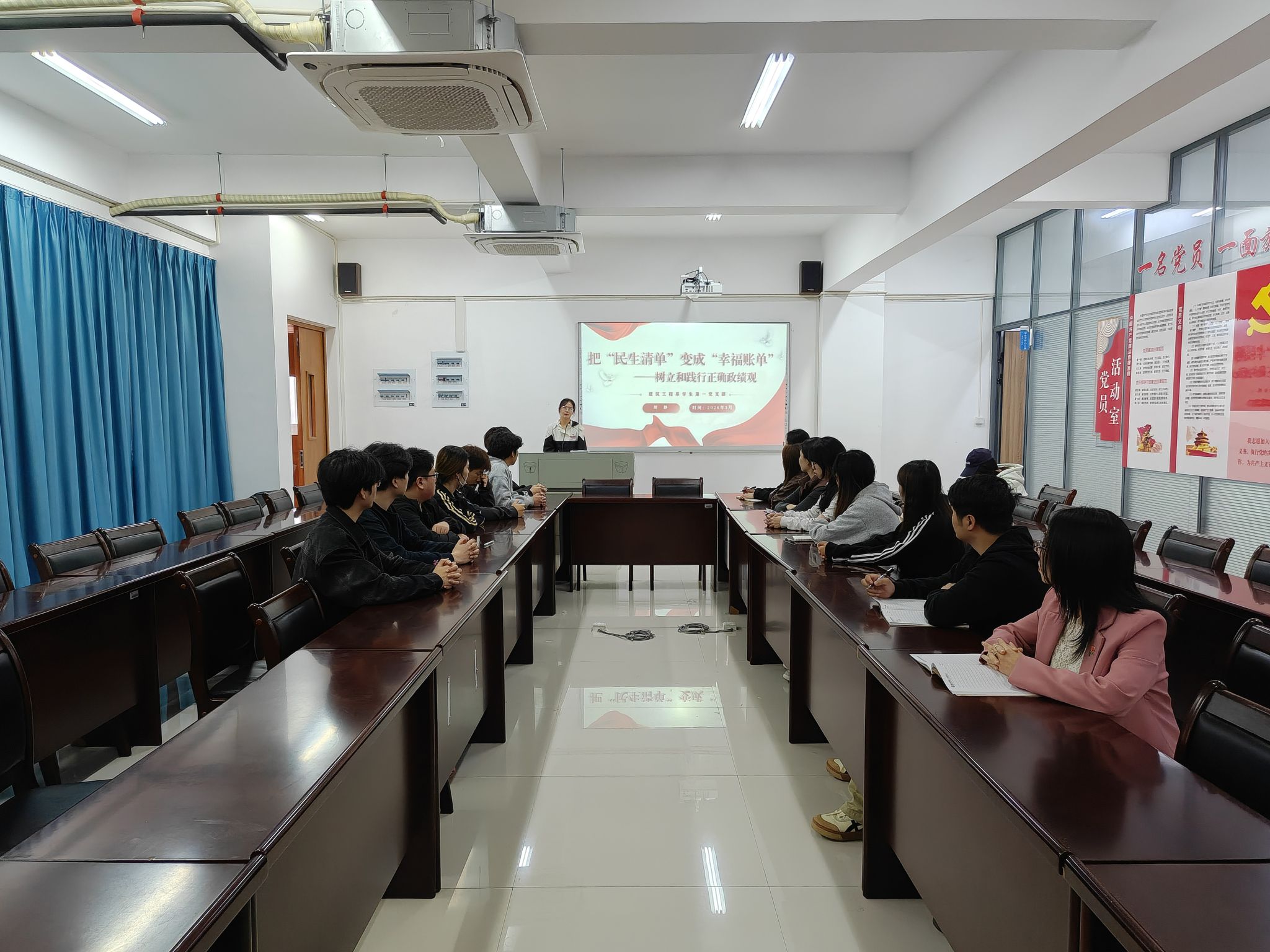 本网讯/为深入学习贯彻习近平新时代中国特色社会主义思想,落实全党树立和践行正确政绩观学习教育部署要求,引导广大学生党员牢固树立正确政绩观,2026年3月26日,建筑工程系学生第一党支部组织开展题为“树立和践行正确政绩观”专题党课,由学生第一党支部书记胡静老师主讲,围绕政绩观这一根本性问题展开深入学习和讨论,引导学生党员和骨干从党性高度认识政绩、以人民立场衡量政绩,并结合学生工作实际探讨如何践行正确的政绩观。