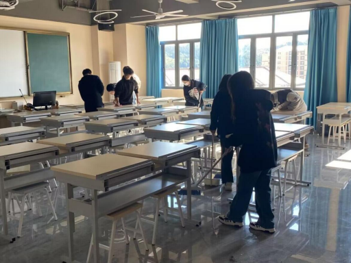 首先由志愿服务部工作人员给班级同学点名进行签到,随后经过有序分工,拿起抹布、拖把、扫把等清洁工具对提前划分好的劳动区域进行打扫。