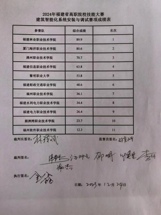 本网讯/12月22日,由福建省教育厅、福建省人力资源和社会保障厅、福建省财政厅、福建省农业农村厅、福建省卫生健康委员会、福建省总工会、共青团福建省委、福建省中华职业教育社主办,福建林业职业技术学院承办的2024年福建省职业院校技能大赛“建筑智能化系统安装与调试”圆满结束,共有来自省内的11支代表队共计22名选手参赛。
